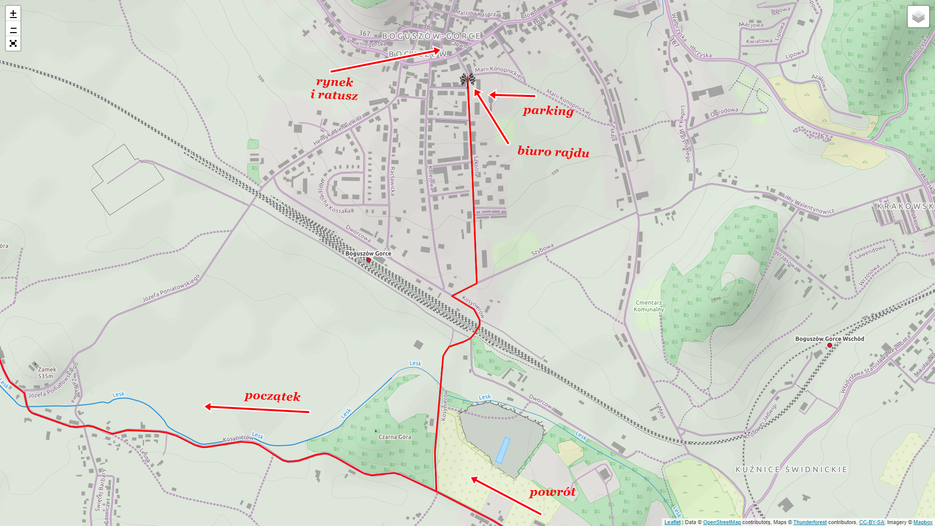 Jednocześnie zwracamy uwagę, że jakkolwiek „ostatni kilometr” ma dosyć bezpieczny charakter, to po wjeździe do Boguszowa-Gorc nie można jeszcze dać porwać się emocjom i zdecydowanie należy zachować ostrożność. Na 3km przed metą jest przejazd kolejowy (obowiązuje znak STOP). Na 2,5km przed metą jest skrzyżowanie w lewo (na łuku i „podwójne”) – choć ruch jest tu przeważnie niewielki, to może zajść potrzeba ustąpienia pierwszeństwa. Na 850m przed metą jest ciasny przejazd pod torami kolejowymi – osobówka i rower się pomieszczą, ale warto być czujnym oraz trzymać się prawej krawędzi. Za wiaduktem skręt w prawo i znów w lewo – choć żeby tutaj być zmuszonym do ustąpienia nadjeżdżającym z przeciwka, to trzeba by mieć wyjątkowego pecha ;)