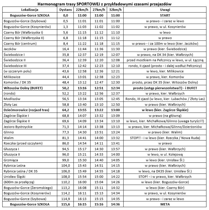 ⇒ start i meta będą w tym samym punkcie, tj. przy ul. Szkolnej. Mając na względzie charakter ostatnich 600 metrów – tryumfalne wjazdy na kreskę przewidujemy niezbyt tłumne i na raczej umiarkowanej prędkości ;) Niemniej finisz lewą stroną drogi jest ZABRONIONY, a konsekwencją może być dyskwalifikacja lub przesunięcie na koniec grupy.