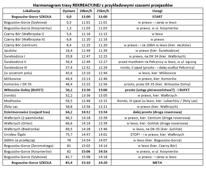 Jako że powyższy opis w głównej mierze dotyczy Trasy Sportowej, dodajmy dla porządku (i uspokojenia!), że w wariancie Rekreacyjnym większości z wymienionych podjazdów po prostu nie ma :) Z rozjazdu tras w Dziećmorowicach przyjdzie łagodnie podjechać do przedmieść Wałbrzycha – a następnie czeka solidna górka w kierunku Unisławia Śląskiego (niezbyt stroma, bo średnio 5% – ale jest tego 3,5-4km). Z kolei Podróżnicy na dodatkowych kilometrach sprawdzą jak szumi las wokół przełęczy Walimskiej i Jugowskiej oraz na finałowym odcinku pod Sokolą (tym razem zamiast główną trasą po coraz głębszych dziurach – proponujemy podjazd będącą w o wiele lepszym stanie ścianką przez „dzielnicę wczasową” ;) W tej opcji do pokonania będzie 144km i ok. 2.500m pionu, a bonus w stosunku do wariantu Sportowego wynosi 28km / 700m pionu.