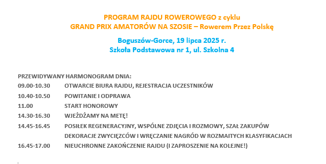 Na IX etap w tegorocznym cyklu „GRAND PRIX AMATORÓW NA SZOSIE – Rowerem przez Polskę” zapraszamy w górne rejony Dolnego Śląska :) Po rocznej przerwie Gospodarzem rajdu w tym regionie znów będzie Boguszów-Gorce, czyli miasto z najwyżej położonym Rynkiem i Ratuszem w Polsce! Jak zawsze wracamy tu z autentyczną radością, a zawitamy rekordowo – bo już po raz piąty!