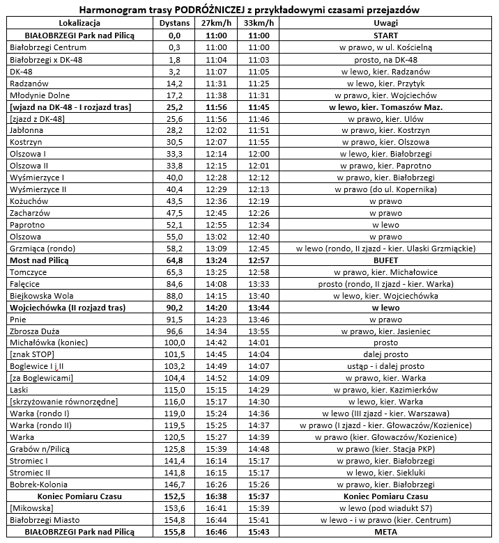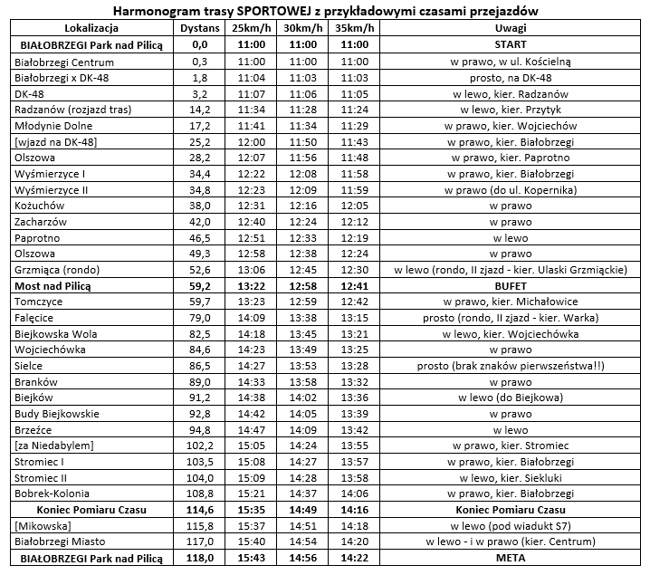 Rozjazdy tras Sportowej (PRO) i Rekreacyjnej (MINI) są dwa. Pierwszy już po 14km w Radzanowie – MINI skręca w prawo, a PRO i GT w lewo (ostrożnie, bo skrzyżowanie jest na lekkim łuku i wzniesieniu – i dobra widoczność jest dopiero na tarczy skrzyżowania). Drugi rozjazd następuje w Woli Biejkowskiej, po 82km trasy PRO (skręca w lewo na Wojciechówkę) i po 57km trasy MINI (jedzie dalej prosto, po głównej – i dopiero za 1,1km skręca w prawo). Ponowne złączenie tras następuje na wjeździe do Biejkowa – i reszta dystansu jest wspólna.