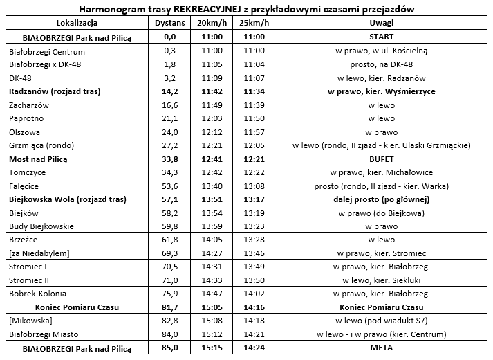 ⇒ zatrzymanie się na BUFECIE jest OBOWIĄZKOWE, a odjazd następuje z zachowaniem kolejności przyjazdu. Dla wszystkich dystansów bufet planujemy przed mostem nad Pilicą w Tomczycach. Dla dystansu PRO postój wypadnie po 59km, dla MINI – po 34km, a dla GT – po 65km (Podróżnikom ewentualny drugi postój polecamy po 120km w Warce – już we własnym zakresie);