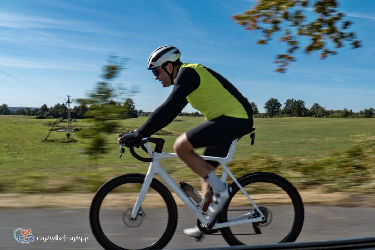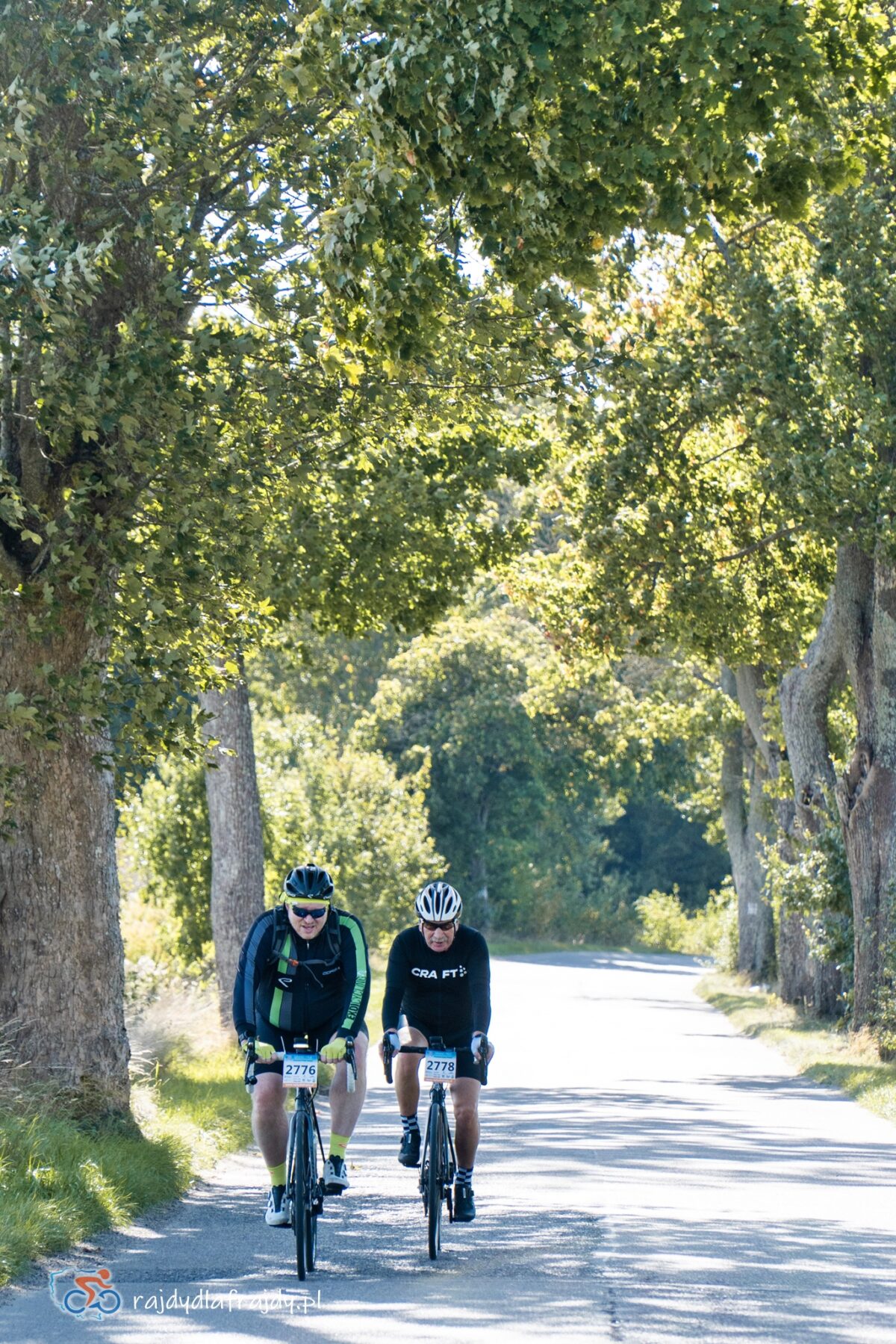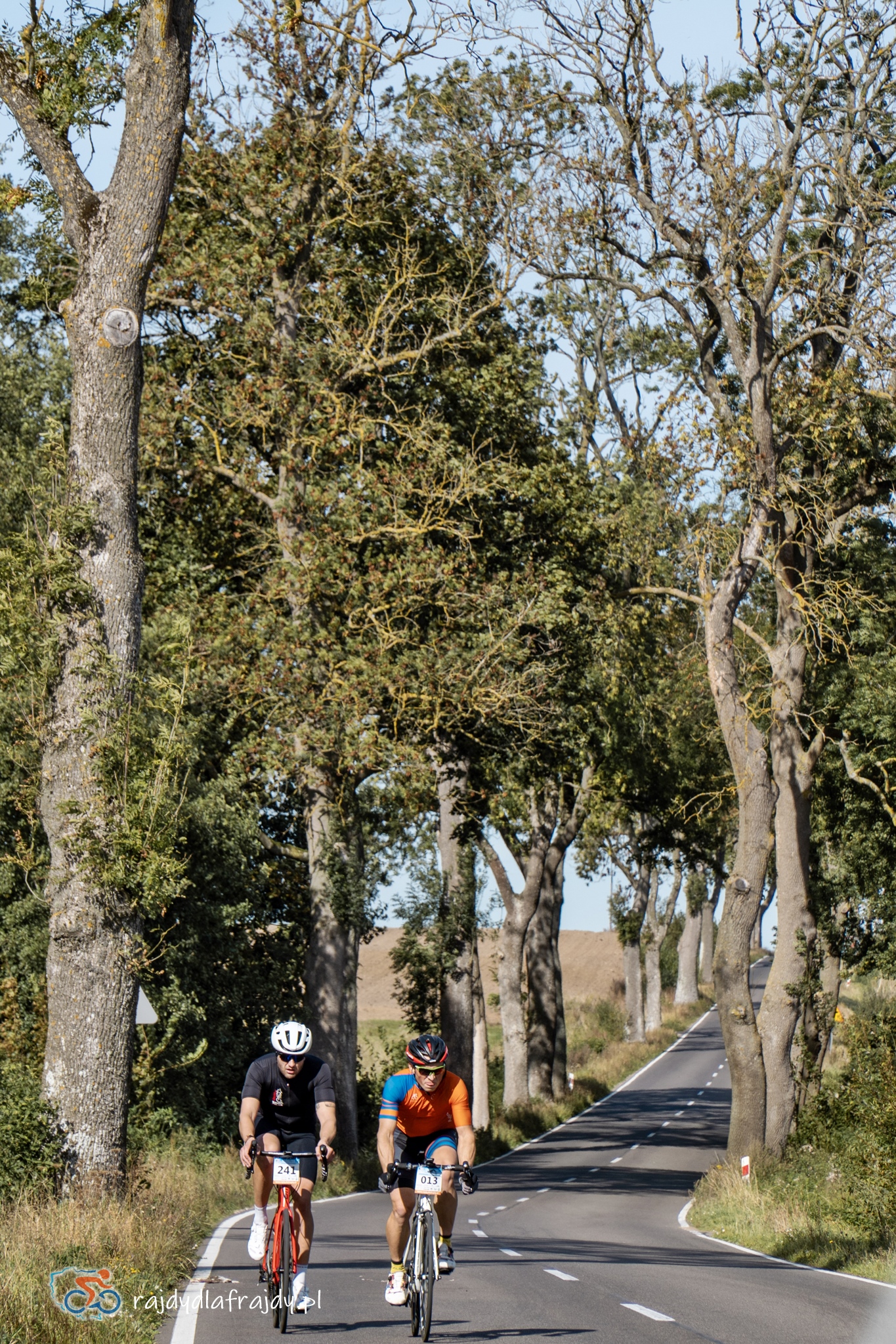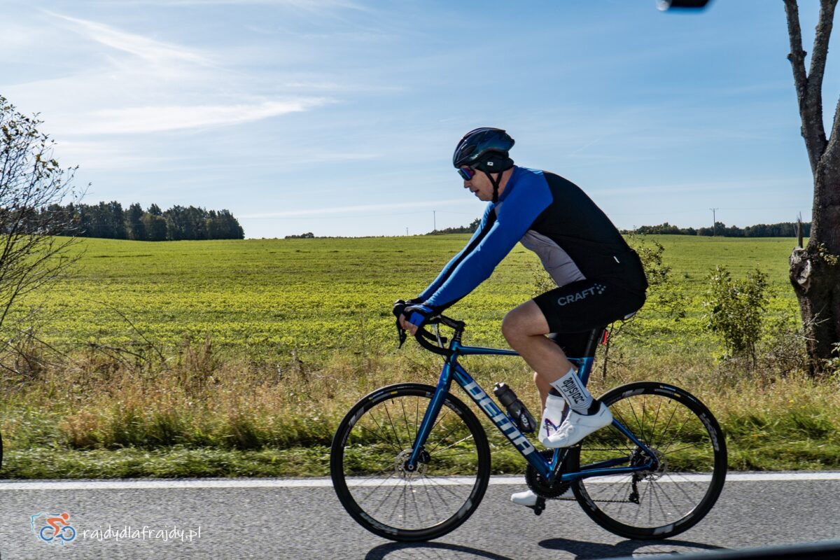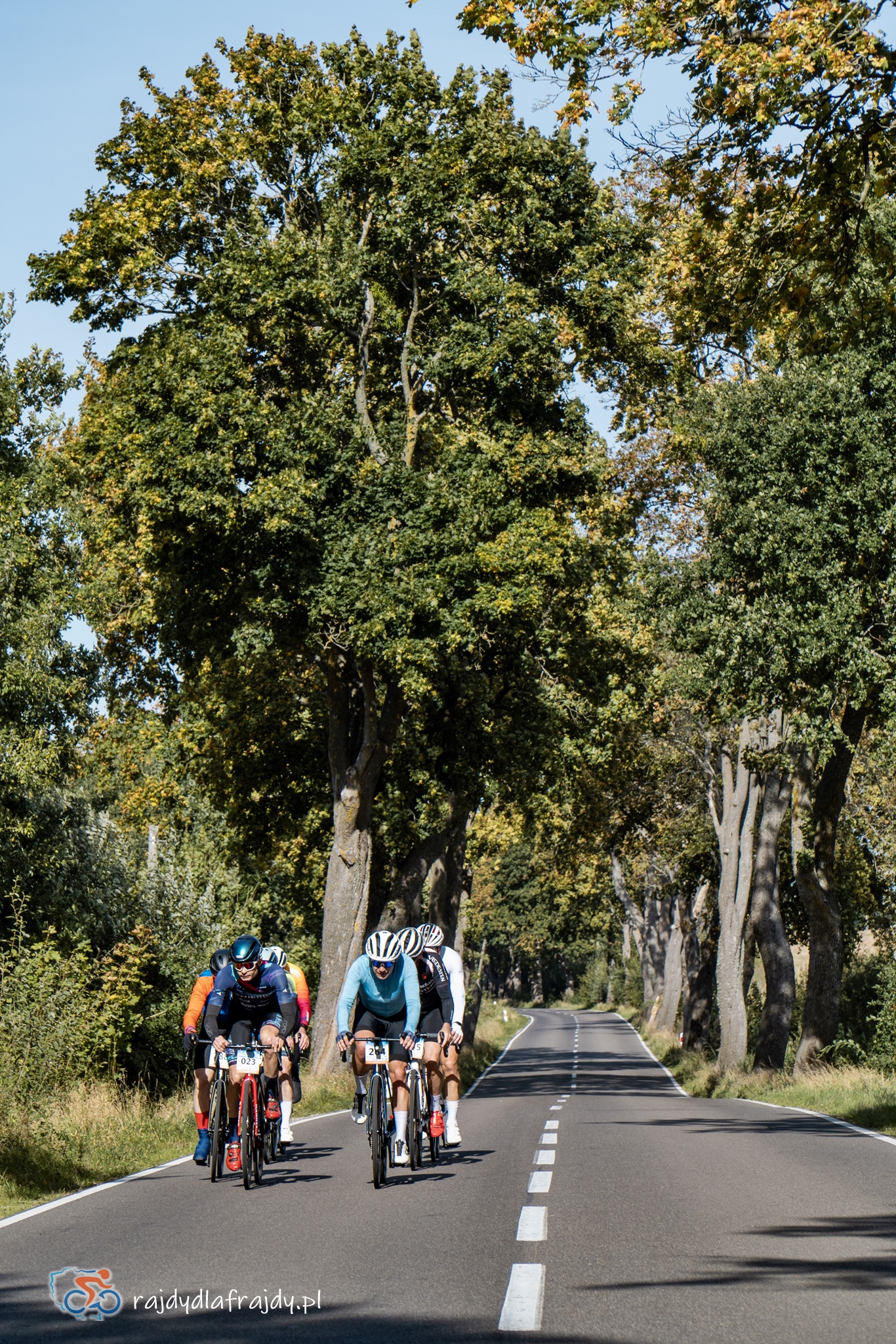 Falowanie wody nie było tego dnia jedynym, ponieważ ku pewnemu zaskoczeniu Uczestników okolica obfituje w niewielkie wzniesienia i pagórki. Jeszcze się człowiek nie zdąży zmęczyć podjeżdżaniem, a już droga wiedzie w dół i rozpędza na nowo! Taki profil terenu utrzymywał się przez większość trasy – tym razem nawet z uwzględnieniem wypłaszczonego odcinka z Chwalimia do Barwic, gdzie trochę niespodziewanie zwinęli stary asfalt i jeszcze nie do końca zdążyli położyć nowy (więc też przez chwilę falowało