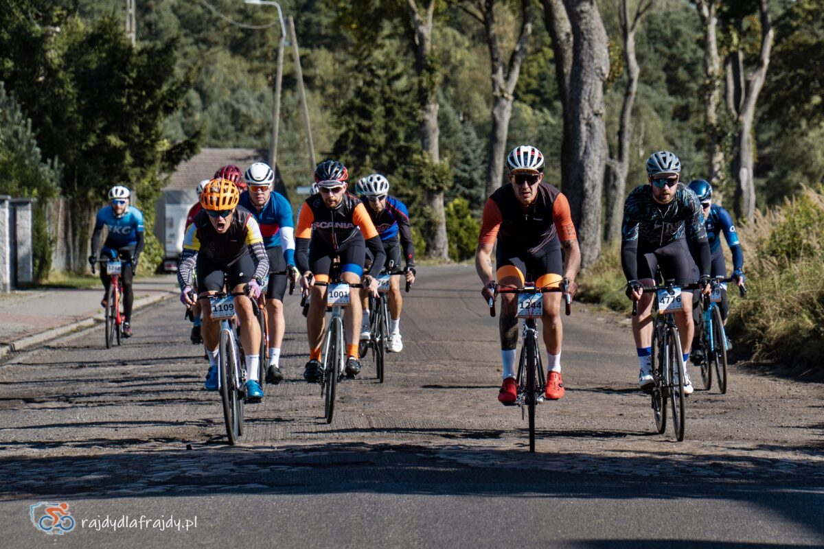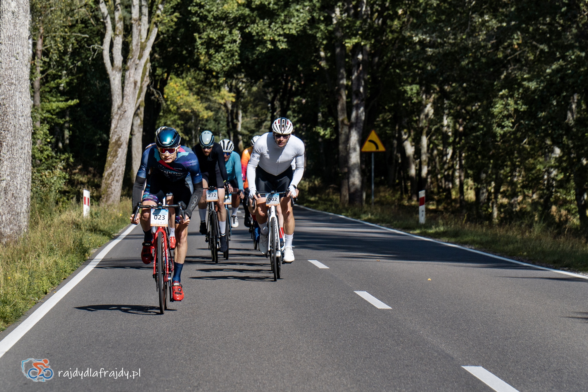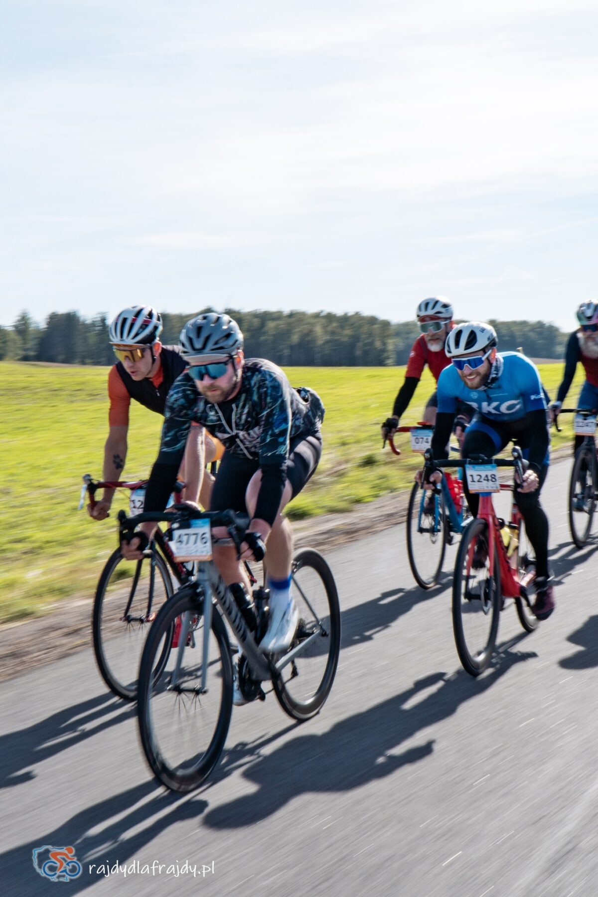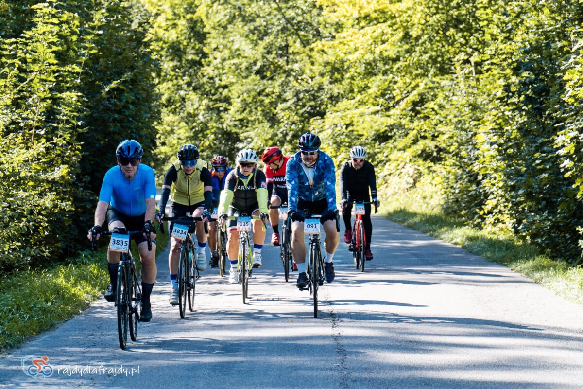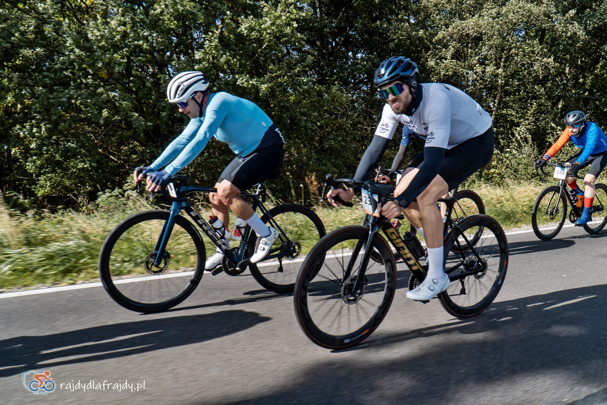 Falowanie wody nie było tego dnia jedynym, ponieważ ku pewnemu zaskoczeniu Uczestników okolica obfituje w niewielkie wzniesienia i pagórki. Jeszcze się człowiek nie zdąży zmęczyć podjeżdżaniem, a już droga wiedzie w dół i rozpędza na nowo! Taki profil terenu utrzymywał się przez większość trasy – tym razem nawet z uwzględnieniem wypłaszczonego odcinka z Chwalimia do Barwic, gdzie trochę niespodziewanie zwinęli stary asfalt i jeszcze nie do końca zdążyli położyć nowy (więc też przez chwilę falowało