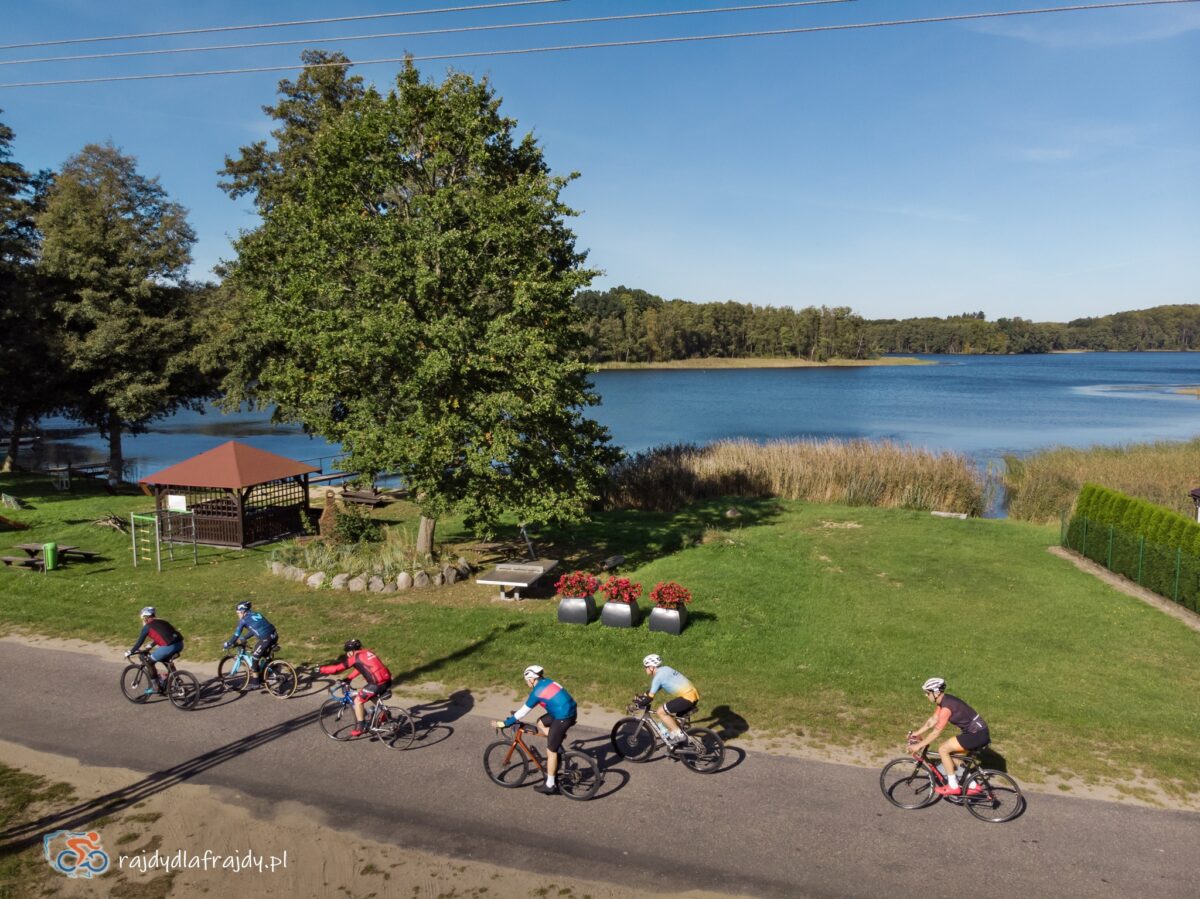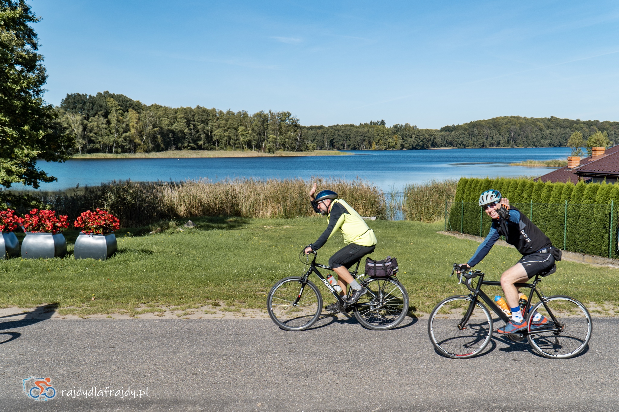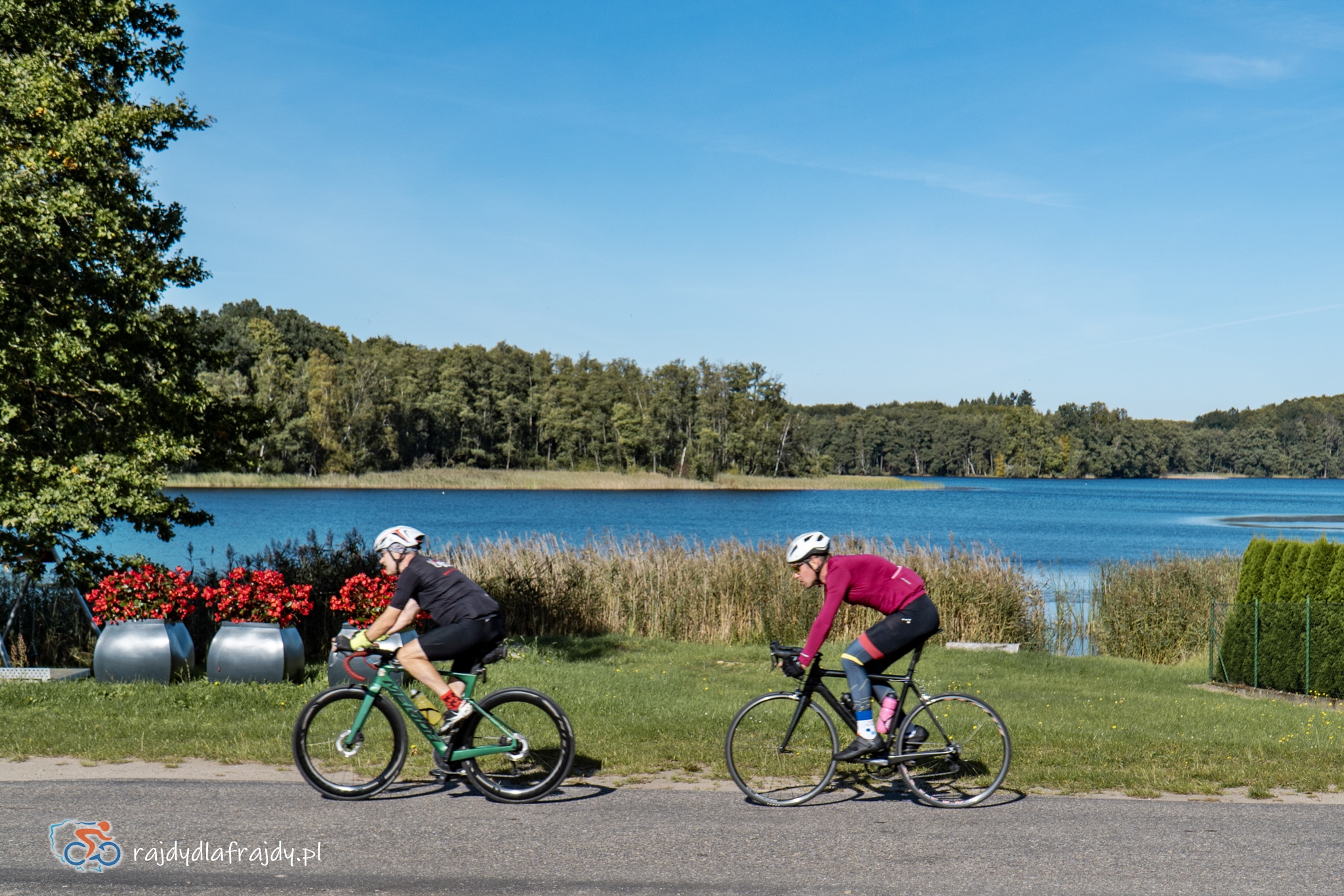 Skoro Szlak Pojezierzy Zachodnich – to gwoździem programu powinny być jeziora! Drobny szkopuł jedynie w tym, że wiele z nich jest albo nieco odsuniętych od drogi – albo przedzielonych pasem drzew czy zabudowań. Na szczęście udało się znaleźć miejsca z pięknym widokiem, gdzie każdy mógł nacieszyć oczy blaskiem łagodnie falujących tafli wody – oczywiście pod warunkiem, że nie był wpatrzony w plecy lub koła koleżanki czy kolegi z przodu. Dlatego najładniejsze kadry zostały utrwalone na zdjęciach – a gdyby ktoś chciał je sobie obejrzeć na spokojnie, to przy najbliższej okazji polecamy odwiedzić np. Ciemino, Juchowo czy Komorze. Dodatkową zachętą powinien być fakt, że można tam nie tylko urządzić sobie miły przystanek na zielonej trawce, ale również spróbować orzeźwiającej kąpieli czy postawić zamek z piasku ![]()