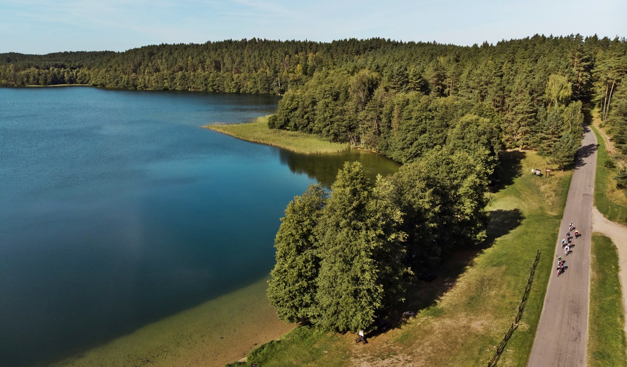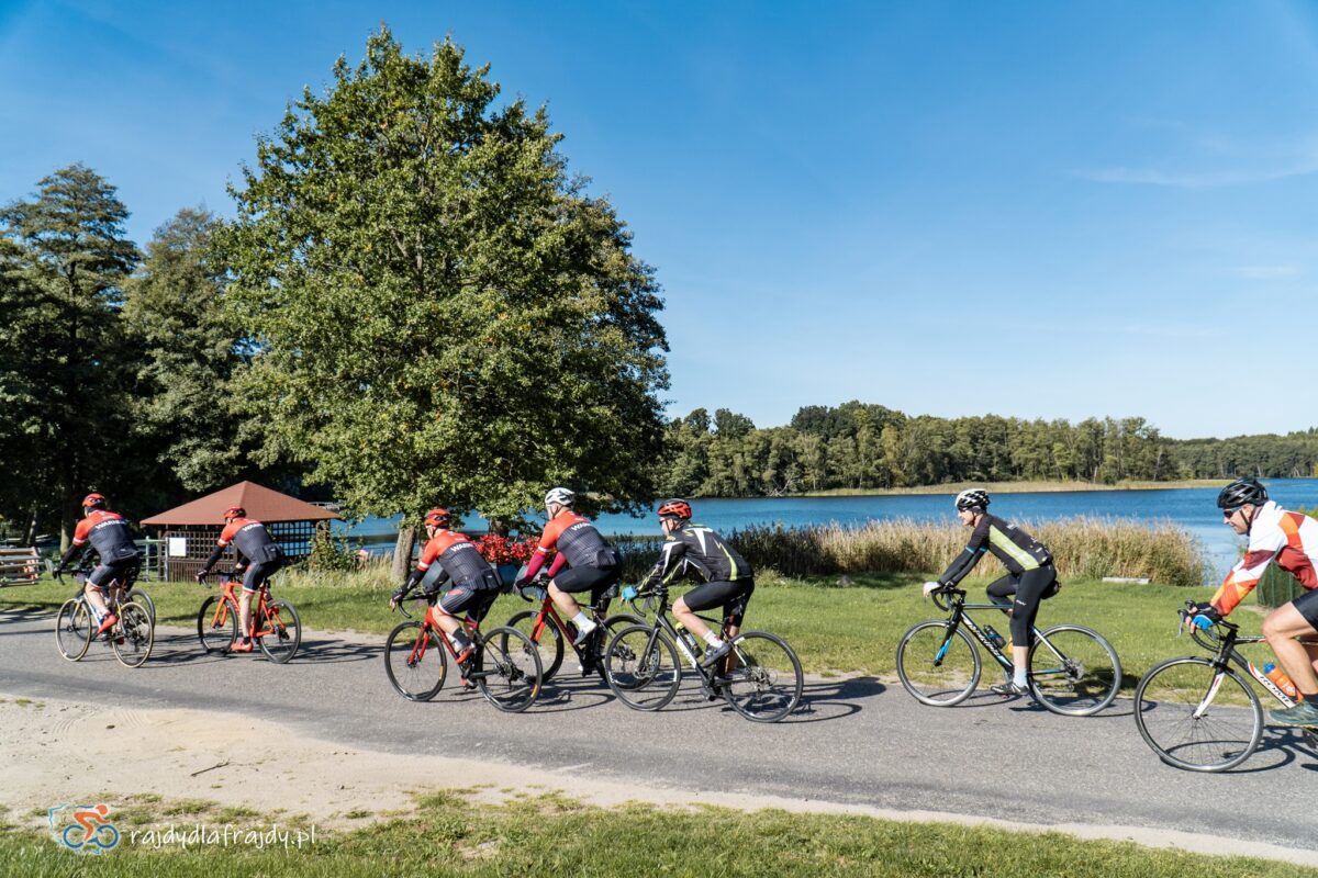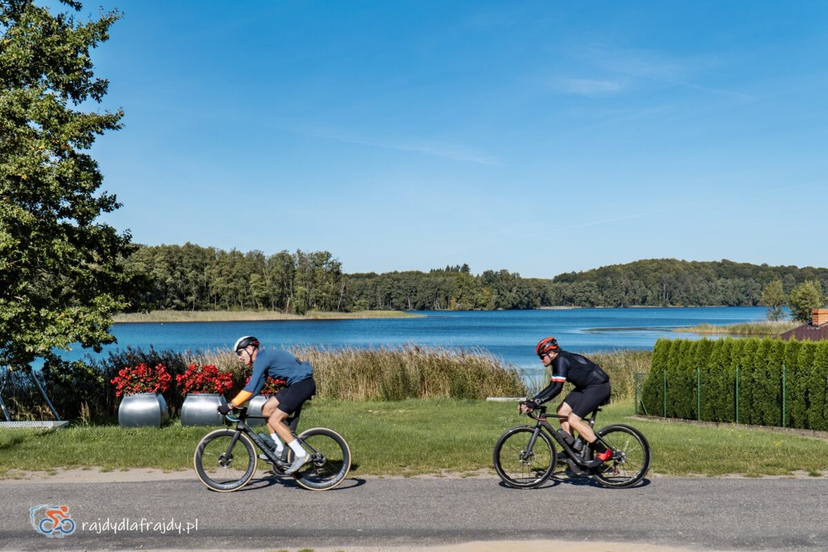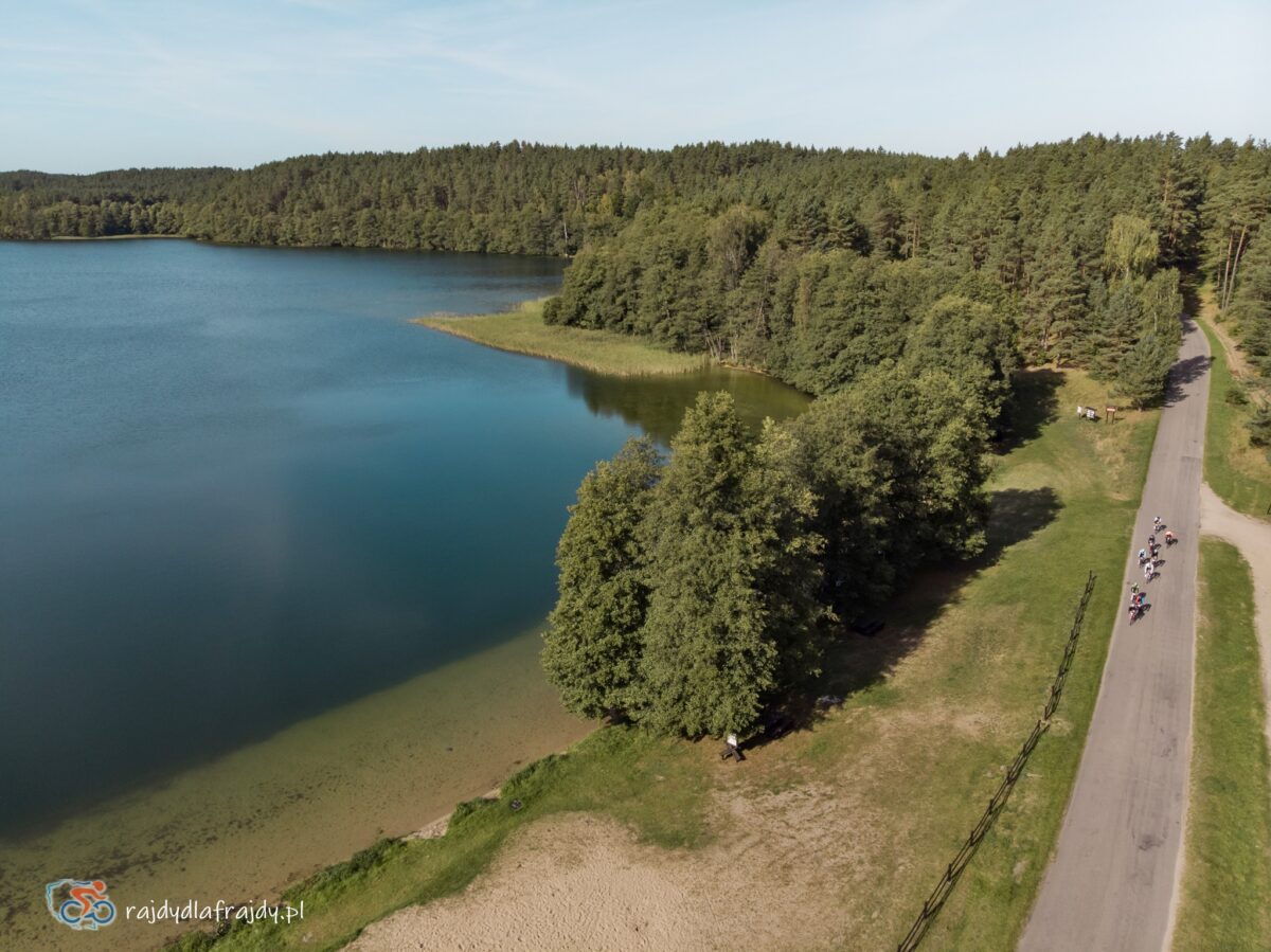 Skoro Szlak Pojezierzy Zachodnich – to gwoździem programu powinny być jeziora! Drobny szkopuł jedynie w tym, że wiele z nich jest albo nieco odsuniętych od drogi – albo przedzielonych pasem drzew czy zabudowań. Na szczęście udało się znaleźć miejsca z pięknym widokiem, gdzie każdy mógł nacieszyć oczy blaskiem łagodnie falujących tafli wody – oczywiście pod warunkiem, że nie był wpatrzony w plecy lub koła koleżanki czy kolegi z przodu. Dlatego najładniejsze kadry zostały utrwalone na zdjęciach – a gdyby ktoś chciał je sobie obejrzeć na spokojnie, to przy najbliższej okazji polecamy odwiedzić np. Ciemino, Juchowo czy Komorze. Dodatkową zachętą powinien być fakt, że można tam nie tylko urządzić sobie miły przystanek na zielonej trawce, ale również spróbować orzeźwiającej kąpieli czy postawić zamek z piasku ![]()