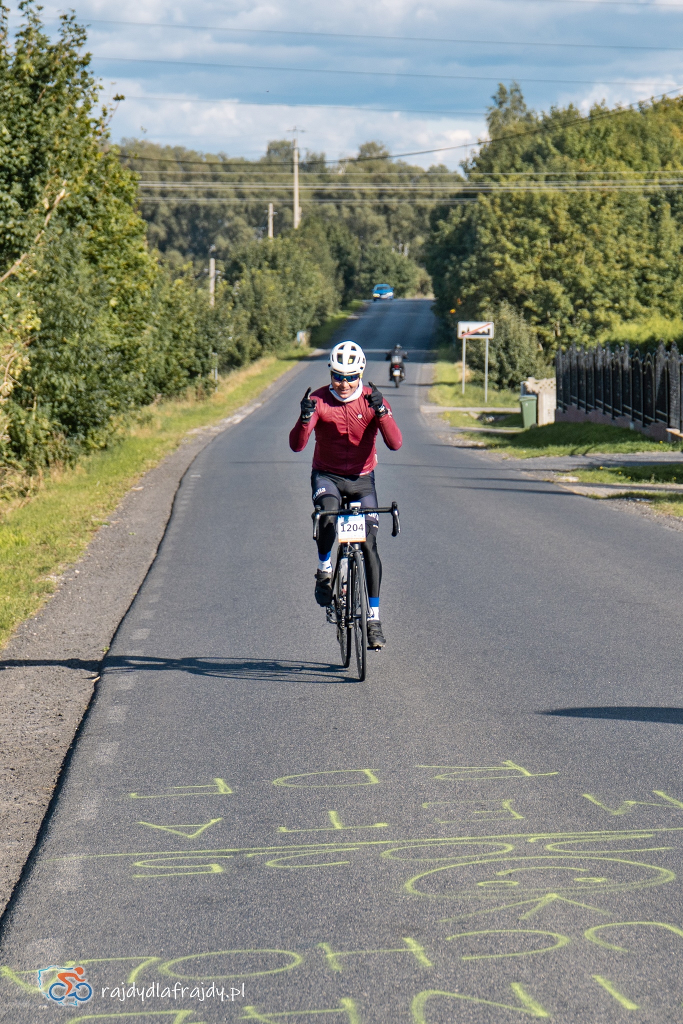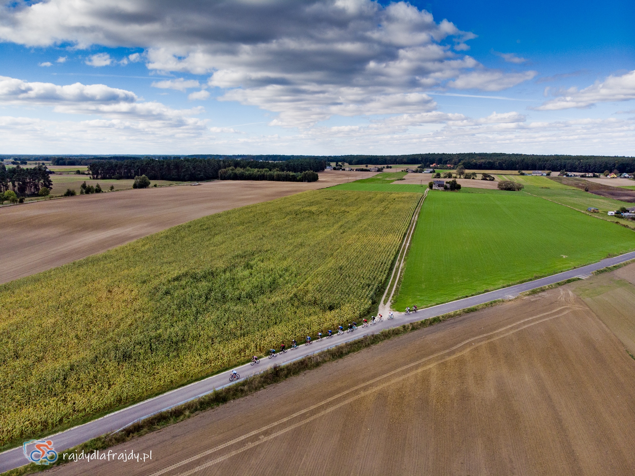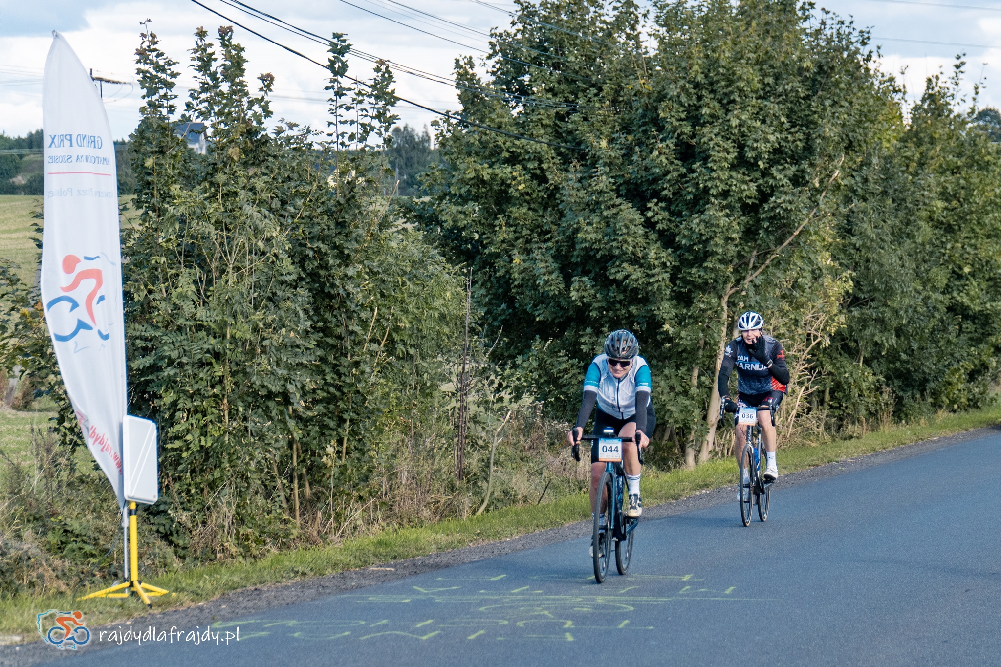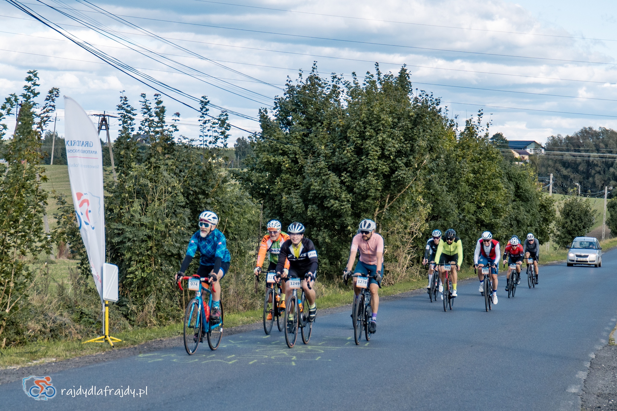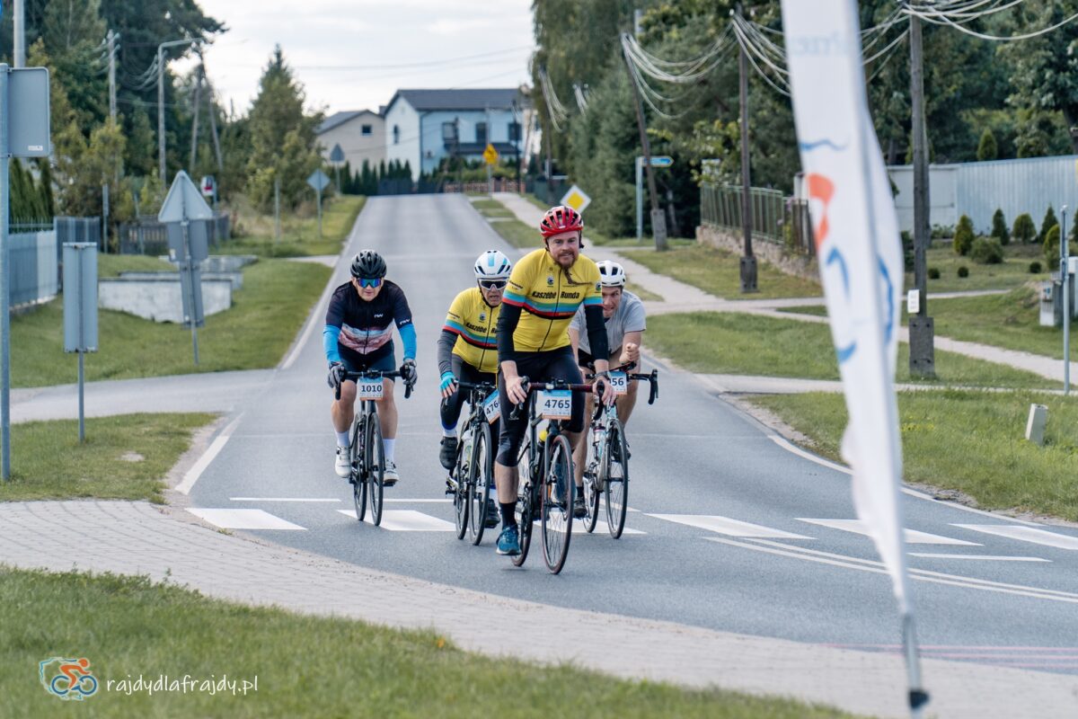 Kolejne kilometry upływały pracowicie, natomiast sądząc po żywiołowych reakcjach na punktach kontrolnych – bardzo pozytywnie i wesoło! Wrześniowe słońce może nie grzało nazbyt intensywnie, ale toczyło zaciekłe pojedynki z tabunem kłębiastych chmur i przez większość czasu tryumfalnie rozświetlało malowniczą okolicę. Do środkowej części trasy udało się też wpleść kilka nowych i niekiedy zaskakujących elementów, z których trzy miały szansę zapaść w pamięci na dłużej. Najpierw „droga której nie było” (i wciąż próżno szukać na niektórych mapach), czyli nowiutki, 3,5-kilometrowy fragment z Bysławka w stronę Lubiewa. Następny taki dywanik zakwitł na schowanej za Jeziorem Zaleskim bocznej drodze przez Lipienicę. Z kolei kawałeczek dalej trzeba było wśród polnej głuszy pokonać po wściekłym bruku mały mostek przerzucony nad torami kolejowymi – jakże inne to były wrażenia od zwykłego przejazdu, niechby nawet dziurawego! ![]()