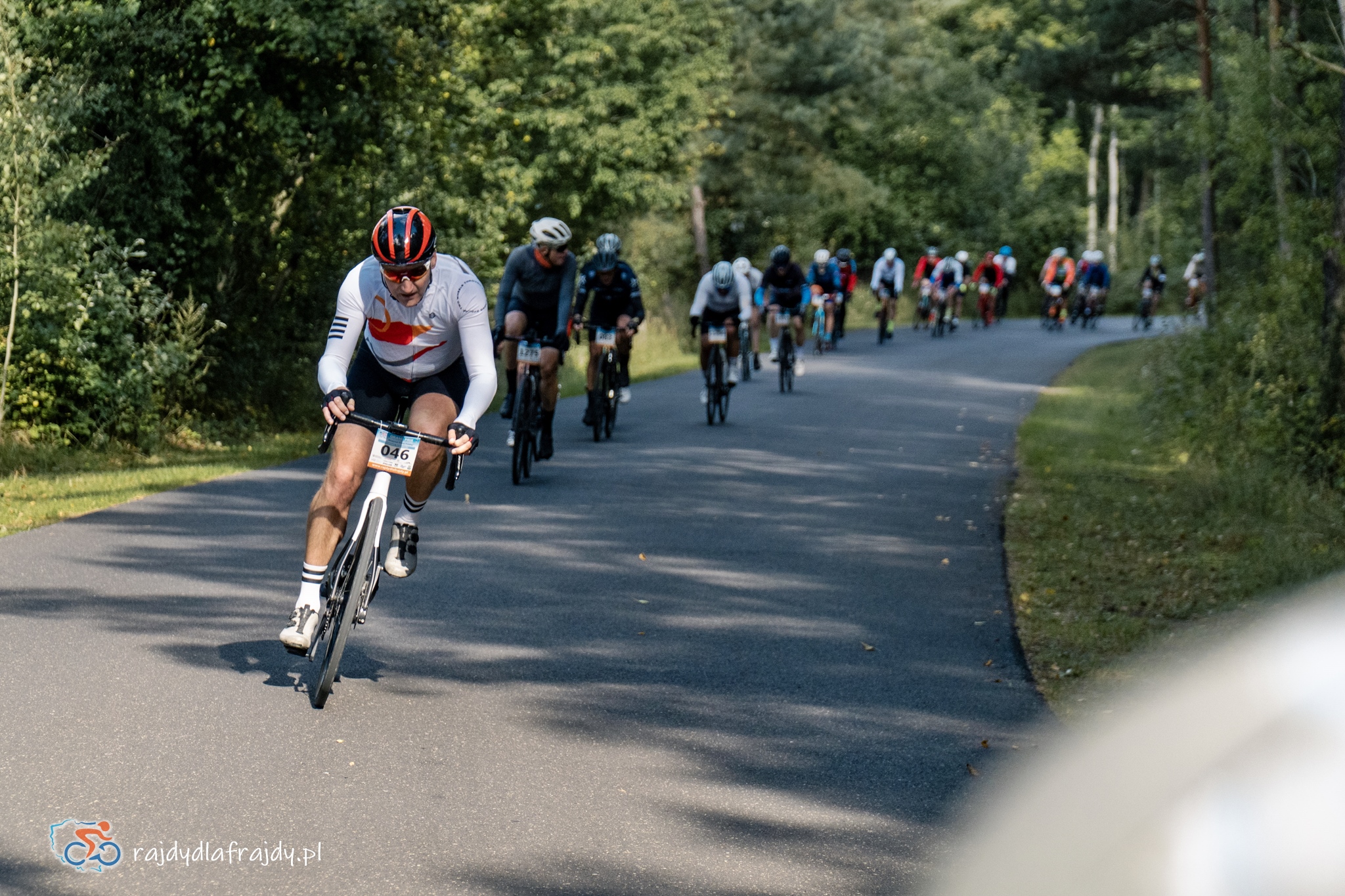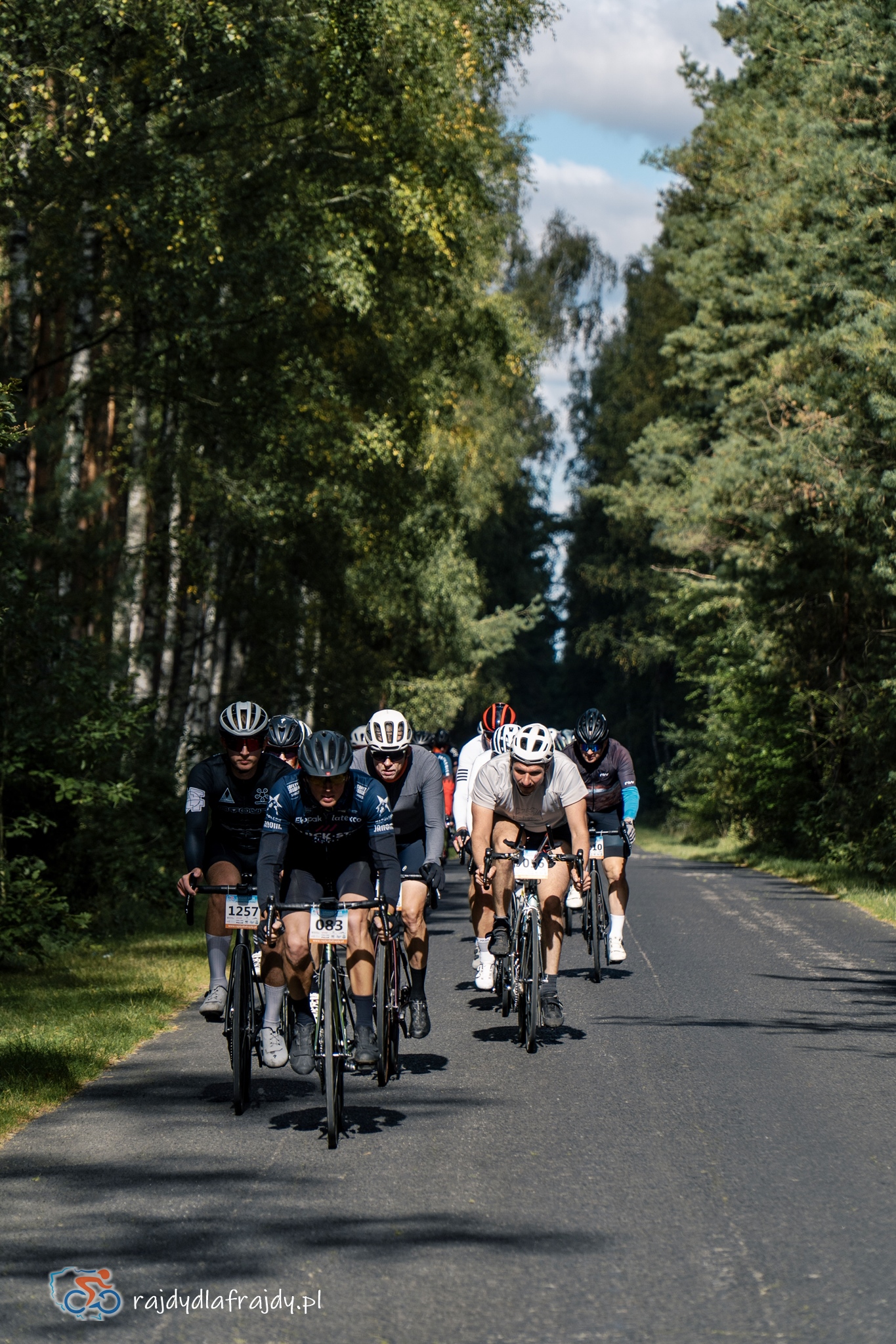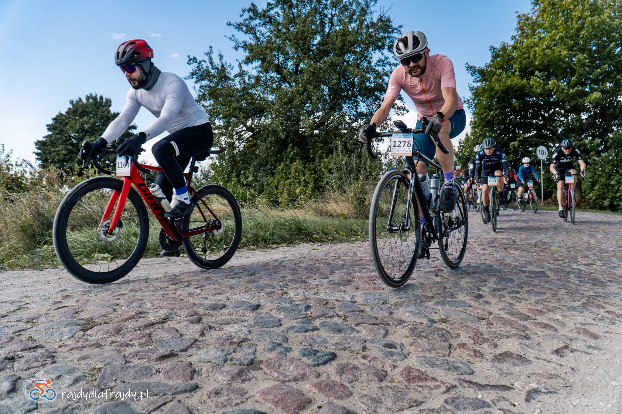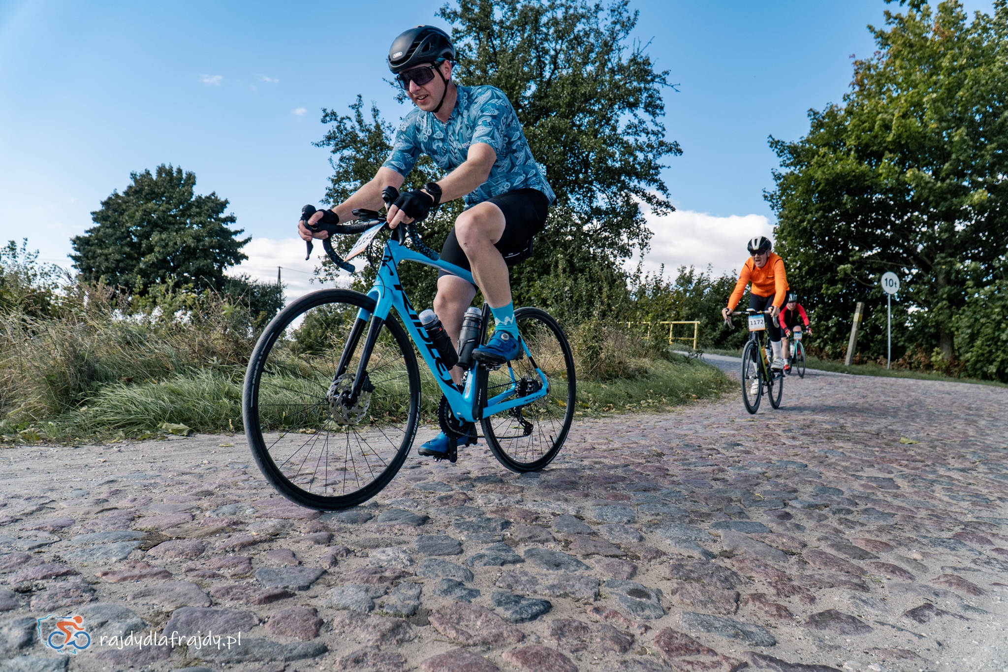 Kolejne kilometry upływały pracowicie, natomiast sądząc po żywiołowych reakcjach na punktach kontrolnych – bardzo pozytywnie i wesoło! Wrześniowe słońce może nie grzało nazbyt intensywnie, ale toczyło zaciekłe pojedynki z tabunem kłębiastych chmur i przez większość czasu tryumfalnie rozświetlało malowniczą okolicę. Do środkowej części trasy udało się też wpleść kilka nowych i niekiedy zaskakujących elementów, z których trzy miały szansę zapaść w pamięci na dłużej. Najpierw „droga której nie było” (i wciąż próżno szukać na niektórych mapach), czyli nowiutki, 3,5-kilometrowy fragment z Bysławka w stronę Lubiewa. Następny taki dywanik zakwitł na schowanej za Jeziorem Zaleskim bocznej drodze przez Lipienicę. Z kolei kawałeczek dalej trzeba było wśród polnej głuszy pokonać po wściekłym bruku mały mostek przerzucony nad torami kolejowymi – jakże inne to były wrażenia od zwykłego przejazdu, niechby nawet dziurawego! ![]()